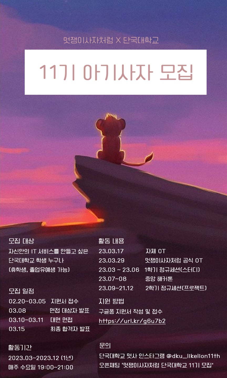 힙스터라이온처럼 프로그래밍협회 동아리에서 단국대학교 11학년 신입부원을 모집합니다.