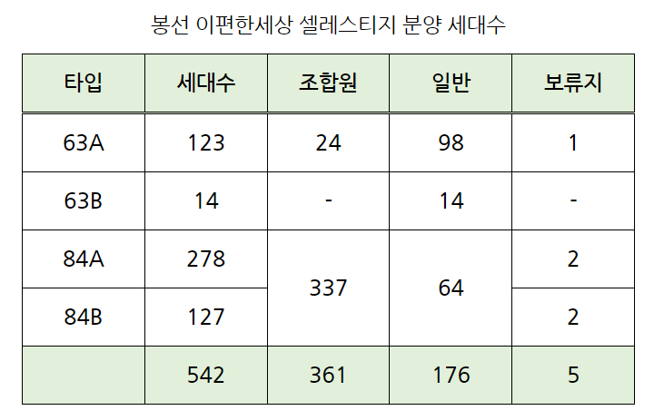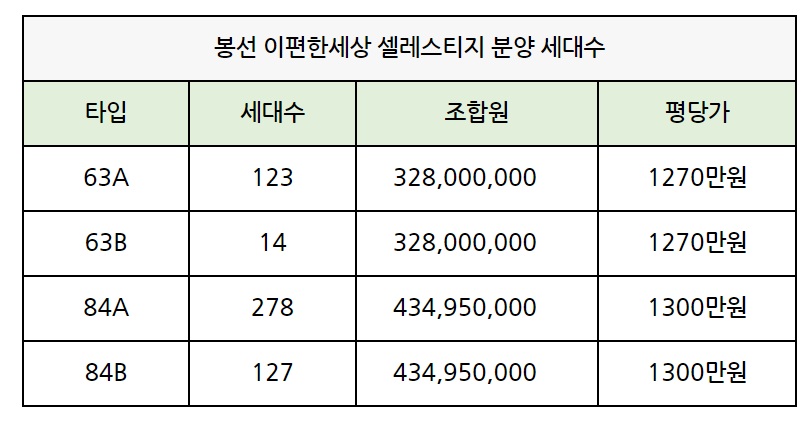 봉선동 셀레스테이지 유형별 잔여세대수입니다.
