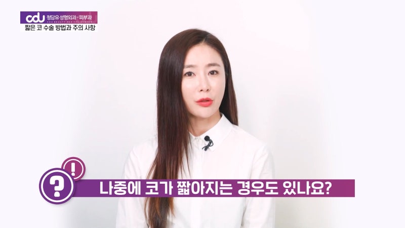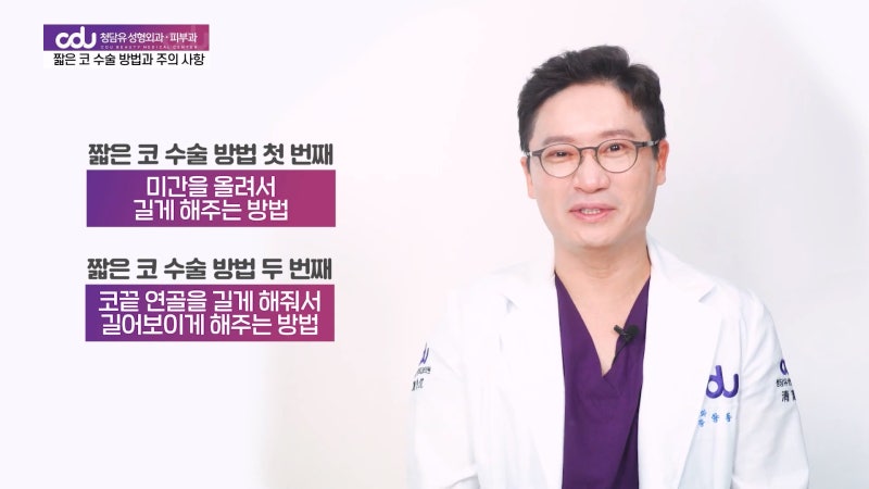 숏코성형은 어떻게 진행되나요? 첫 번째는 눈썹을 살짝 올려서 길어 보이게 하는 방법입니다. 단순히 필러나 보형물을 추가하여 눈썹을 길게 할 수 있습니다. 두 번째는 코끝 수술입니다. 코끝 수술 프로그램은 연골 성형술과 연골 이식을 시행합니다. 먼저 짧은코성형에서는 코끝을 이루는 익상연골을 들어 올려 연골성형을 진행합니다. 콧볼연골과 상측두연골 사이의 틈을 절개하여 아래로 재고정하면 연골이 아래로 내려가면서 코의 길이가 길어집니다. 그리고 연골이식은 연골성형의 효과를 보지 못하는 분들을 위한 방법입니다. 비중격연골과 콧볼연골 사이에 여분의 연골을 이식하여 콧볼연골을 낮추어 코끝을 길게 합니다. 나중에 코가 짧아졌나요? 예. 대표적인 예로 코성형시 사용하는 이물질이 구축을 일으켜 코가 짧아질 수 있습니다. 코에 이물질이 들어가면 우리 몸에서 방어막 역할을 하는데 이 과정에서 염증이 생기면 코의 모양이 변형되고 코끝이 들뜨게 되는데 이것이 구축이다. 이런 경우에는 다양한 형태의 짧은 코성형을 하더라도 먼저 사용한 보형물을 제거하기 위한 재수술이 필요합니다. 연골성형외에 다른 방법은 없나요 짧은코성형 카테고리에서 연골성형외에 다른 방법이 있습니다. 콧대 자체가 높아지지 않고 콧구멍이 보이고 콧대가 위로 기울어져 있는 경우에는 콧볼 수술로 개선할 수 있습니다. 콧구멍이 정면에서 삼각형으로 보이는 경우 필러로 콧구멍을 채우면 콧구멍이 도톰해지고 삼각형이 둥글고 덜 눈에 띕니다. 마지막으로 코 밑에 필러를 넣어 코를 길어 보이게 하는 방법이 있다. 짧은코 수술 후 주의사항은? 일반적인 코수술과 비슷하다고 보시면 됩니다. 3일 동안은 앉거나 자는 것을 피해야 합니다. 또한 세균 감염의 위험이 있으므로 일주일 동안 세수를 하지 마십시오. 선글라스나 안경을 최대 2개월 동안 착용하는 것도 어렵습니다. 2개월 전에는 물에 들어가는 운동인 수영을 피해야 합니다. 무엇보다 가장 중요한 주의사항이 있습니다. 부상을 방지하기 위해 흡연과 음주를 피하십시오. 짧은코수술의 종류와 수술방법, 주의사항을 충분히 숙지하신 후 청담류성형외과에서 상담을 받아 나에게 맞는 방법을 선택하시고 안전한 수술계획을 세우시기 바랍니다. 짧은 코 수술 방법 영상으로 시청하세요 CDU 청담유 CDU PLASTIC SURGERY 성형외과 슬기로운 삶! 성형과 피부에 대한 모든 것을 가감 없이 알려주는 ‘양동준 원장’! 홈페이지I 홈페이지 http://cdups.co.kr/ 페이스북|페이스북 https://www.facebook.com/cheongdamu/ 인스타그램|인스타그램 https://www.instagram.com/cdu_ps/ 카카오톡|카톡 아이디 http: //pf.kakao.com/_rPZsE/chat 매주 수, 일요일 오후 5시에 CDU의 새로운 영상을 만나보세요! www.youtube.com 서울특별시 강남구 삼성로145길 6 CDU 유청담성형외과 2층