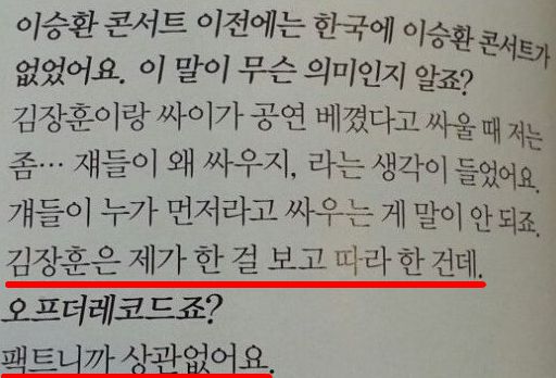 2012년 공연 절도 논란으로 불화설이 불거진 싸이와 김장훈에 대해서도 언급하며 “두 사람이 싸운다고 했을 때 ‘왜 싸우는 거지’라고 생각했다. 김장훈이 내가 하는 걸 보고 따라왔다”고 자신의 성취에 자부심을 드러냈다.