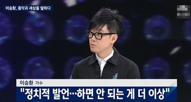 또한 이승환은 2017년 11월 16일 방송된 tvN ‘인생술집’에 출연해 “근혜-이명 박문화예술계 블랙리스트에 내 이름은 없었다” 등의 발언을 했다. – 박정권이나, 2018년 11월 30일 KBS 연예주간은 “‘특정 정당 지지자’랑도 연애 불가”라고 방송해 화제가 됐다.