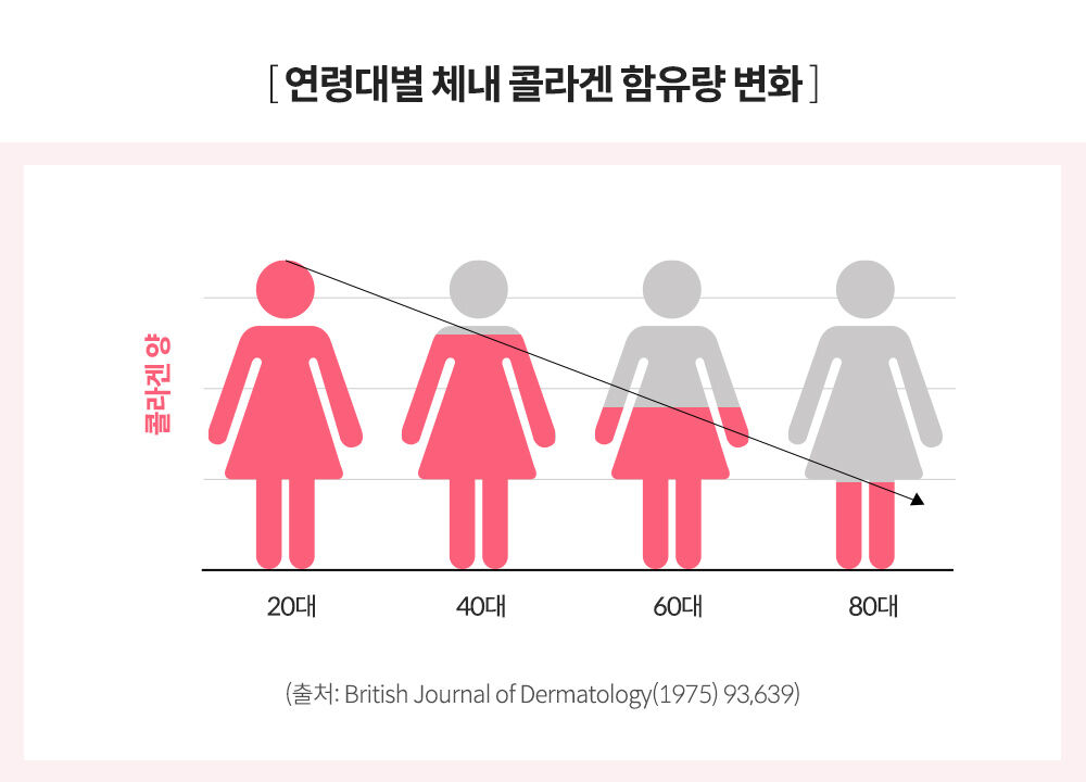 피부에서 스스로 생산 합성할 수 있는데 나이가 들면서 체내 합성이 줄어드는 것으로 알려져 있는데 40세가 지나면 콜라겐 합성량이 급격하게 줄어든다. 체내 합성만으로는 부족하기 때문에 20대부터 돌보기 시작했다고 한다.